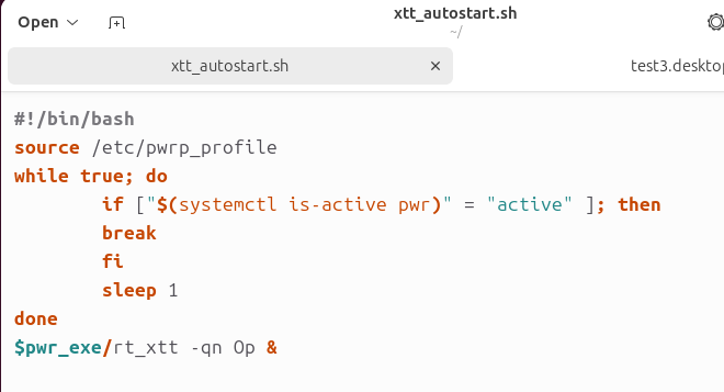 #!/bin/bashsource /etc/pwrp_profile while true; do if [ $(systemctl is-active pwr) = "active" ]; then break fi sleep 1done $pwr_exe/rt_xtt -qn Op &